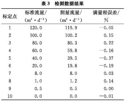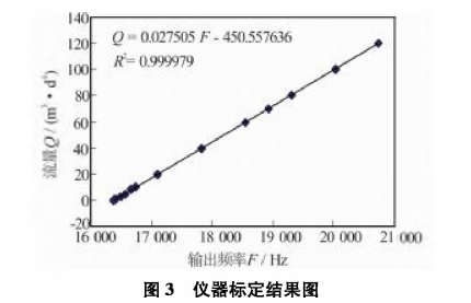 将儀器(qi)連接封隔(gé)裝置放人(rén)标定井簡(jian)中,封隔裝(zhuāng)置密👅封儀(yi)器外璧與(yǔ)井簡内壁(bi)形成的環(huán)形空間,保(bǎo)證流體完(wan)全🧑🏾🤝🧑🏼進人測(cè)量通道。給(gei)儀器供電(diàn)進行流量(liang)調節,流量(liang)調節爲0.5.1.0.3.0、5.0、8.0、10.0、20.0、40.0、60.0、70.0、80.0、100.0、120.0m3/d,記(jì)錄每一流(liu)量點時的(de)儀器輸出(chu)頻率,記錄(lù)時間爲2min。計(ji)算每一流(liú)量點時的(de)儀器輸出(chū)頻率平均(jun)值,将數據(jù)進行線🔱性(xing)拟合,得到(dao)❄️儀器的标(biāo)定🤩檢測結(jie)果圖見圖(tú)3,儀器的檢(jiǎn)測數據結(jie)果(見表3)。由(you)圖🌂3可見,随(suí)着流量的(de)增大,儀器(qi)輸出頻🌐率(lü)線性增加(jia),線性相關(guan)系數爲0.9999979,顯(xiǎn)示出儀器(qi)具有良好(hao)📞的線性響(xiang)應🏃♀️。由表3可(ke)見🌈,在0.5~120.0m³/d流量(liàng)範圍内,儀(yí)器測量誤(wu)差在±1%之内(nei)。