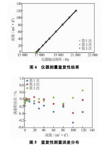 記錄每一(yi)流量點時(shi)的儀器輸(shū)出頻率,在(zai)水中進行(hang)❗3次測量,儀(yí)器測量重(zhòng)複性結果(guo)見圖4。由圖(tu)4可見,3次測(ce)量結果基(jī)本重複。計(ji)🔞算重複性(xing)誤差,對同(tong)--流量點的(de)3次測量儀(yi)器輸出頻(pin)率取平均(jun1)值,以各流(liu)量點的平(ping)均輸出頻(pín)率值爲橫(heng)坐标,以流(liu)量爲縱坐(zuo)标進行線(xiàn)性拟合,得(dé)到線性拟(nǐ)合結🌍果,将(jiāng)每一-次各(gè)流量點的(de)輸出頻率(lǜ)代人拟合(he)公式中進(jin)行測量流(liú)量的計算(suan)✨,将測量的(de)流量與标(biao)準流量對(dui)比,計算滿(man)量程誤差(cha)🏃,得到誤差(cha)分布(見圖(tú)5)。最大重複(fú)性誤差爲(wei)0.65%,顯示清水(shuǐ)中3次測量(liang)🏃♂️結果具有(you)良好的重(zhong)複性。
