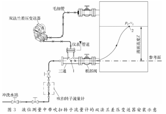 煤氣(qi)化裝置中液體(ti)吹掃的典型應(ying)用是差壓法測(ce)👅量氣化爐❌激冷(leng)室液位。由于氣(qì)化爐激冷室内(nei)的激冷水⛹🏻♀️爲複(fú)雜混合物,既含(han)有易堵塞的固(gu)體顆粒.物,也含(han)有腐蝕性📱成分(fen),因此一般采用(yong)雙🔞法蘭差壓變(biàn)🌈送器進行測量(liang)。變送🚩器負壓側(ce)法蘭隔膜與激(jī)冷室内的氣相(xiang)接🥵觸,無需吹掃(sao),而變送器正壓(yā)側法蘭隔㊙️膜則(ze)與激冷水接觸(chu),必須引入🌍沖洗(xi)水以防止取壓(ya)口堵塞影響液(ye)位測量,并延長(zhang)變送器的壽命(mìng)。帶吹❄️掃轉子流(liu)量計的雙法蘭(lan)差壓變送器安(ān)裝如圖3所示。