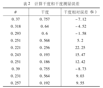 因爲(wei)式(3)和(10)有着非常(cháng)相似的數學表(biao)達式,根據數理(lǐ)統計知識可知(zhi)它們是有聯系(xì)的,圖3可知,這兩(liǎng)張圖的中的R和(he)x及B和x的對應關(guān)系基本一緻,所(suo)以由B代替R時,認(rèn)爲它會影響θ的(de)取值但不會對(duì)其變化趨勢帶(dai)來過大的波動(dòng)。鑒于本文是研(yán)究θ值的影響因(yin)素,這裏假設R=B。如(ru)果按照文獻(10)的(de)方法,那麽在此(cǐ)試驗數據的範(fan)圍内參數θ應爲(wei)一定值。通過式(shi)(1)計算得到的θ值(zhí),以及用此測量(liang)值計算的幹度(dù)值和相對誤差(chà)如表2所示。
