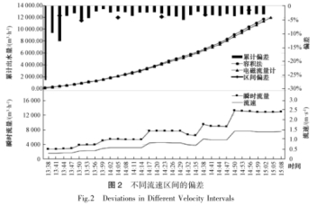 本次(cì)測量兼顧了不(bu)同的流速區間(jiān),在不同流速(0.30、0.42、0.58、0.84.0.98、1.40m/s)區(qu)間的偏差分别(bié)是-3.65%、-5.35%、-4.24%、-3.95%.-3.35%、-1.62%,如圖2所示。