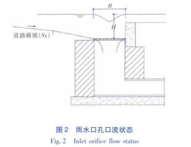 當(dang)雨水流(liú)量增加(jia)、雨水口(kǒu)算前水(shui)深(H)較深(shēn)時,雨水(shui)逐漸淹(yan)沒整個(ge)雨水口(kǒu)算,轉變(bian)成以孔(kong)口流形(xíng)式流人(rén)雨水口(kǒu),如圖2所(suǒ)示。