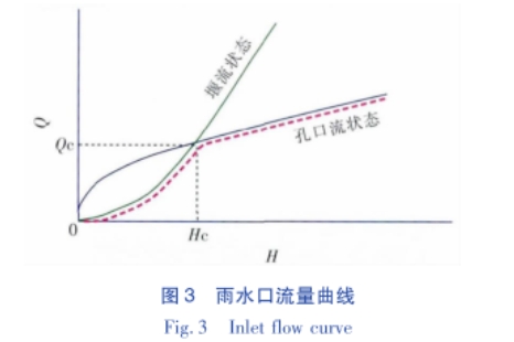 雨水口(kou)流量曲(qǔ)線見圖(tu)3。如圖3所(suo)示,綠色(se)爲堰流(liu)狀态的(de)流量曲(qu)線,藍色(sè)爲孔口(kou)流狀态(tai)的流量(liang)曲線。而(er)圖中紅(hong)色虛線(xiàn)所示,即(jí)爲雨水(shuǐ)口的實(shi)際流量(liàng)特性。在(zai)箅前水(shuǐ)深較小(xiao)時,表現(xian)爲堰流(liú)狀态;在(zài)算前水(shui)深較大(dà)時,表現(xian)爲孔口(kou)流狀态(tai)。而當箅(bì)前水深(shēn)爲臨界(jie)深度He時(shí),堰流狀(zhuang)态與孔(kǒng)口流狀(zhuàng)态的計(jì)算流量(liàng)相同,均(jun1)爲Qc.