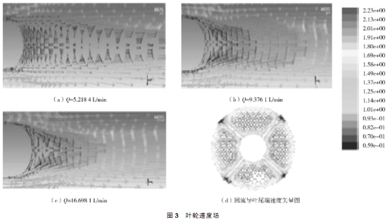 分别取流量(liàng)爲5.2184L/min、9.3761L/min、16.6981L/min對葉輪流(liu)場仿真分析(xī),獲得上述流(liú)🌏量下🙇♀️葉輪❌後(hòu)導流架後端(duān)速度矢量圖(tu)(圖3(a),(b),(c)所示),可見(jiàn)流體🐉與前導(dao)流架前🛀🏻端碰(pèng)撞産生低速(su)區,靜壓力變(bian)大,且随流量(liàng)增大而變㊙️大(dà),壓力損失明(ming)顯;流體進入(rù)前導流架後(hou),流速加快,雷(lei)諾數增加,湍(tuān)流強度變大(dà)。流體進入葉(yè)輪前,先流經(jīng)葉輪與前後(hou)導流架連接(jie)🍉的槽,由于槽(cao)内流速低,此(cǐ)時流量的速(su)度分布不均(jun)🔆,且有強渦流(liú)産生。回流導(dao)葉尾端速度(du)矢量圖如圖(tú)3(d)所✨示,流體在(zai)後導流架後(hòu)端出現長尾(wěi)流,尾流長度(du)随流量增大(da)而減小。