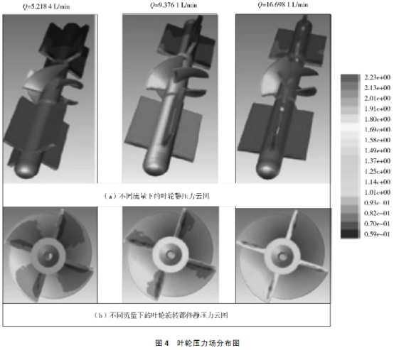 分析(xi)上述三個不(bú)同流量時流(liú)道内壓力場(chang),發現随着流(liu)量增加,葉輪(lún)、導流架上遊(yóu)面形成的靜(jing)壓變高,葉片(pian)上遊面和葉(yè)片下遊面的(de)壓力随着流(liu)量的增加而(er)減小(如圖🔞4所(suo)示),可見,導流(liú)架端部的形(xing)狀、葉輪與導(dao)流架之間凹(āo)槽寬度、葉輪(lun)🈲面積和形🧑🏽🤝🧑🏻狀(zhuang)對葉輪穩定(dìng)旋轉均有明(ming)顯影響。