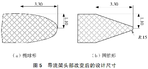 基于(yu)上述CFD仿真分(fèn)析結果,爲有(you)效減小葉輪(lun)壓力.損失,将(jiang)原導🏃♂️流架頭(tou)部的球形分(fèn)别設計橢球(qiu)型和圓錐形(xíng),改進後的導(dao)流架頭部尺(chǐ)寸如圖5所示(shi)。