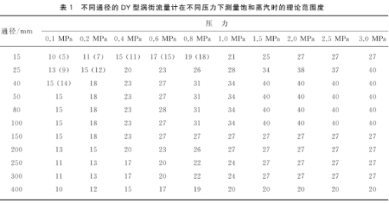 渦街流(liú)量計具(jù)有範圍(wéi)度寬的(de)特點。在(zai)用于測(ce)量蒸汽(qi)流量時(shí),一些制(zhi)造廠商(shang)宣傳的(de)範圍度(du)可以做(zuò)到40倍.但(dan)對其所(suo)提供的(de)資料進(jìn)行具體(ti)分析時(shi),也隻有(yǒu)一部分(fèn)中小通(tong)徑的儀(yi)表,在流(liu)體壓力(li)較高時(shí),理論範(fàn)圍度能(neng)夠達到(dào)40倍0],而作(zuò)爲關口(kou)蒸汽計(jì)量使用(yong)的大通(tong)徑儀表(biǎo),範圍度(dù)要小得(de)多。例如(rú)DY300型DN300渦街(jie)流量計(ji),在用來(lai)測量表(biao)壓爲p=1.0MPa的(de)飽和蒸(zhēng)汽時.理(li)論範圍(wei)度爲24倍(bèi)。不同通(tong)徑的DY型(xíng)渦街流(liu)量計,在(zài)不同壓(ya)力條件(jiàn)下測量(liang)飽和蒸(zheng)汽時的(de)理論範(fan)圍度見(jian)表1所列(liè)。