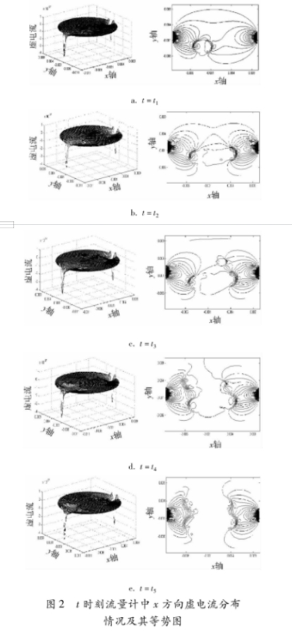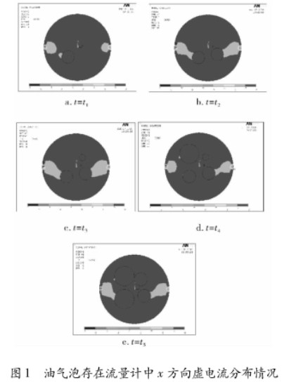圖(tú)1所示爲流量計截(jié)面中油氣泡非導(dao)電物質)增加與變(bian)🔞化時的Ansys仿真圖,圖(tú)la~e中分别顯示的是(shi)t1~t5時刻虛電流x方⛱️向(xiang)分量的An-sys圖。