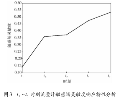 爲了清晰地獲得(de)以上5種情況下油(you)氣泡對流量計🧑🏽🤝🧑🏻虛(xu)電流分布的影響(xiǎng),運用敏感場靈敏(min)度來刻畫非導電(dian)物質在不同情🥵況(kuàng)下對流量計敏感(gǎn)場靈敏度的響應(ying)特性。圖3所示爲♌以(yi)上5種多個非導電(dian)物質存🏃♂️在情況對(duì)流量計敏感場靈(líng)敏度響應特性分(fen)析。從圖3中可以看(kàn)💁出,随着非導電物(wù)質的個數在流體(ti)中✉️的增加,流量計(ji)敏感場靈敏度也(yě)不斷增加,說明對(dui)電磁流量計的輸(shū)出信号的影響也(yě)越大.圖3中t3時刻敏(min)感場靈敏度c較t2時(shi)⭐刻增加較小,這是(shì)13;時🔅刻增加的🚶♀️油氣(qi)泡較小,而在t1~t5時刻(ke)增加的油氣泡較(jiao)大時,流量計敏感(gan)場靈敏度c變化較(jiao)大,說明流體中出(chu)現較大的油氣泡(pào)對流量計測量影(yǐng)🛀響較大。