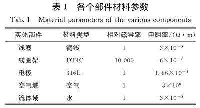 有限(xian)元網格(gé)的質量(liang)直接影(ying)響計算(suàn)精度,采(cǎi)用自動(dong)網格劃(huà)分,單元(yuán)形狀爲(wei)四面體(ti),粗網格(gé)和細網(wǎng)格之間(jiān)過渡并(bing)不光滑(huá),因此将(jiāng)流體域(yù)和空氣(qì)域之間(jian)的測量(liang)管域的(de)網格單(dan)元大小(xiao)設置爲(wei)2mm。網格劃(hua)分後,導(dǎo)入Anrsys中進(jin)行單元(yuan)類型、材(cai)料、實常(chang)數、載荷(hé)、邊界條(tiáo)件和場(chang)路耦合(he)單元設(shè)置。線圈(quān)用銅線(xian)實現,匝(zā)數共6500匝(zā),其截面(mian)積爲2.72×10-4:mm²,體(tǐ)積爲1.49×10-5mm3;線(xian)圈坐标(biao)系單獨(du)定義爲(wei)局部柱(zhu)坐标系(xì),軸向爲(wèi)正Y方向(xiang),其餘部(bu)件的坐(zuò)标系使(shǐ)用全局(jú)笛卡爾(er)坐标系(xì),軸向爲(wèi)正Y方向(xiang)。各個部(bu)件的材(cái)料參數(shù)設置見(jiàn)表1。