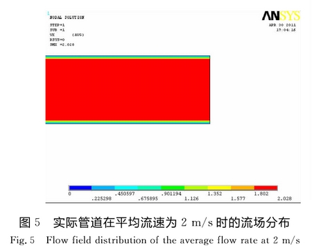 因(yin)此,當管(guan)道内平(píng)均流速(su)V>0.092m/s時,管道(dào)内的流(liu)動狀态(tài)爲紊流(liú);事實上(shàng),四電極(ji)外流式(shì)電磁流(liú)量計在(zài)工作的(de)時候,管(guǎn)道内大(da)多數的(de)流動速(su)度都大(dà)于這個(ge)值。當管(guan)道内的(de)流動狀(zhuàng)态爲紊(wen)流時,用(yòng)CFD軟件進(jin)行流場(chang)分析、計(jì)算,通過(guo)CFD模拟,可(kě)以分析(xī)并且顯(xiǎn)示流體(ti)流動過(guò)程中發(fa)生的現(xian)象,及時(shí)預測流(liu)體在模(mo)拟區域(yu)的流動(dòng)性能[10],用(yong)有限元(yuán)軟件Ansys中(zhōng)的FLOTRANCFD模塊(kuài)對其流(liu)場進行(hang)仿真分(fèn)析,計算(suan)結果如(rú)圖5所示(shi)。