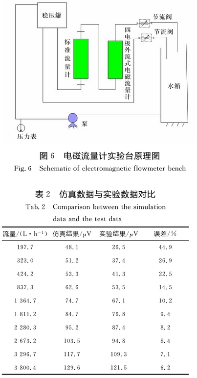 在紊流(liu)場共選(xuǎn)定了10個(gè)不同的(de)流量值(zhi),獨立電(dian)壓源編(bian)程爲兩(liǎng)值矩形(xing)波,幅值(zhi)爲15V,頻率(lǜ)爲1Hz,對流(liu)量數據(jù)進行了(le)仿真計(jì)算,并在(zai)實驗台(tai)上得出(chu)了實驗(yan)數據,實(shí)驗台采(cai)用精度(dù)爲0.5%的電(diàn)磁流量(liang)計讀取(qǔ)流量值(zhi),用信号(hao)處理電(dian)路采集(ji)四電極(ji)外流式(shì)電磁流(liú)量計的(de)感應電(dian)動勢信(xìn)号,通過(guo)串口輸(shu)入到計(jì)算機顯(xian)示,實驗(yan)台原理(lǐ)圖如圖(tú)6所示,最(zuì)後對這(zhè)2種數據(jù)進行了(le)誤差分(fèn)析,結果(guǒ)見表2。