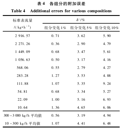 表4爲各組分的(de)附加誤差,附加(jia)誤差表示熱式(shì)氣體質量🐇流量(liang)💚計僅由于氣體(tǐ)組分的變化對(dui)質量流量測量(liang)的誤差,其定義(yi)✍️式爲: