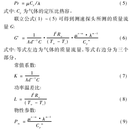 式中:I爲測速探(tàn)頭的供電電流(liu);Rw爲速度探頭的(de)電阻值;h爲測速(su)探頭對流表面(mian)換熱系數;A爲測(ce)速探頭的⭕外表(biao)面積㊙️;Tw爲測速探(tan)☀️頭的溫度;Te爲測(ce)溫探頭測量的(de)流體溫度。