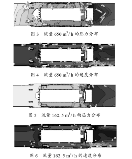 該次數值模拟(nǐ)流量爲650,260,162.5,32m/h的情況,以(yǐ)下選取其中兩種(zhong)情況進行分析。如(rú)圖3和圖4所示,爲流(liu)量650m³/h時的z平面上的(de)壓‼️力(Pa)和速度(m/s)分布(bù)圖。從圖3可以明顯(xiǎn)看出渦輪流🌍量計(jì)的壓力損失主要(yào)集中在💞前後導流(liú)器和葉輪部分,而(ér)在其他部位的壓(ya)力損失很小;速度(du)分布圖🌈也很好地(di)反映出渦輪流量(liàng)計内部的流動情(qing)況。從流量.162.5m³/h時的壓(ya)力(Pa)和速度(m/s)分布圖(tu)🍓,如圖5-6所示,可以得(dé)到相同的結論,兩(liǎng)種流量下,壓力和(he)速度是相似的,但(dan)大小有所不同。