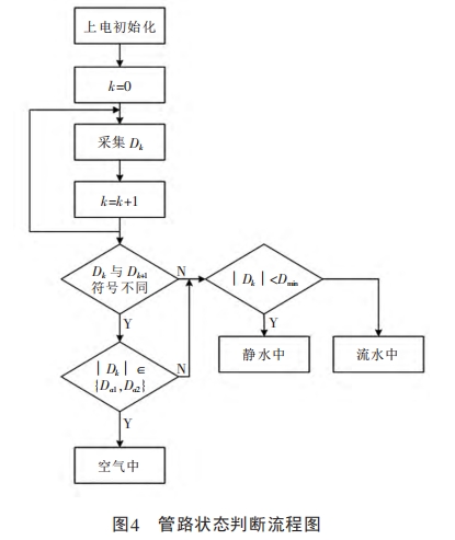 圖3所示(shi)的流程爲測量系(xì)統采樣數據的處(chu)理過程♈,因此未涉(shè)及勵磁、通信等功(gong)能模塊。系統對采(cǎi)集的原始數據進(jin)行判斷,區分電極(ji)處于空氣、靜水或(huo)流水等三㊙️種不同(tóng)狀态,如圖4所示。