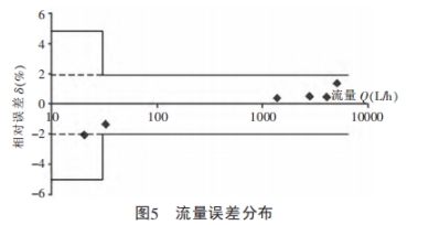 經過上述測量(liang)方法與數據處理(lǐ)後的DN20管徑試驗樣(yàng)機測量結果如表(biǎo)1所示。從表中可以(yi)看出,在常用流量(liang)Q3(4000L/h)内,流量傳感器具(ju)🔆有很好的流量特(te)性,在R200範圍内相對(duì)誤🐪差≤2%,在R160範圍内相(xiàng)對誤差≤1%。其流量誤(wù)差分布如圖5所示(shi),在☂️全流量範圍内(nèi),測量誤差全部在(zài)MPE(最大允😘許誤差)内(nèi)。