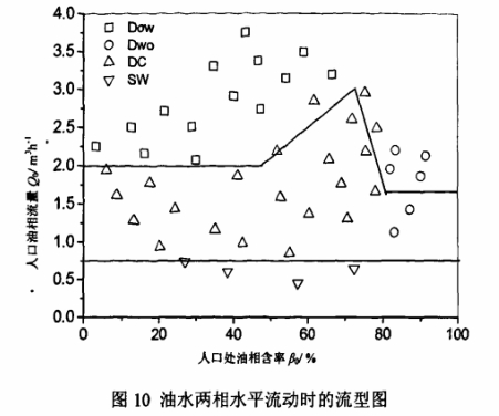 爲(wèi)了考察渦輪(lún)流量計計量(liang)精度與流型(xíng)之間的關系(xi),繪制了粘度(dù)爲50mPa·s時的流型(xing)圖,并且與以(yǐ)前的學者得(de)到的流🔴型圖(tu)🔞進行㊙️了比較(jiào)。實驗中流型(xing)是觀察實驗(yàn)管段得到的(de)🛀,同時采用Lafin和(hé)Oglesby提出的方法(fa)來定義流型(xing)5)。在一定的混(hùn)合流速和輸(shū)入油相含率(lü)下,在水平實(shi)驗管段觀✔️察(chá)到了四種🌈流(liú)型,即:分層☂️流(liu)(SW),雙連續流(DC),油(yóu)含水(W/O)以及水(shui)含油(O/W)。圖10給出(chū)了🌈實驗中得(de)到的流型圖(tu),其中固定線(xian)爲Lovick和Angeli在2001年得(de)到的流型圖(tu).