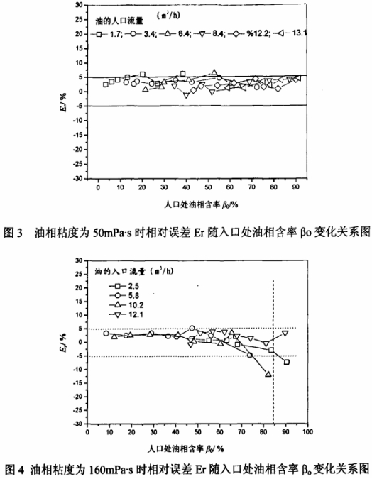 圖3至(zhi)圖9給出了在(zai)七種不同粘(zhan)度下,渦輪流(liú)量計的測量(liàng)誤🤩差随入口(kǒu)處油相含率(lü)的變化關系(xì)圖。以實際應(ying)用中可以🏃♀️接(jiē)受的誤差+5%作(zuo)爲其有效工(gōng)作區間的判(pàn)斷标準(在圖(tu)中,+5%的區間用(yòng)🐪虛線标出),并(bing)且在每個圖(tu)标上,用一條(tiao)豎直的虛線(xiàn),作爲有效工(gōng)作區域的分(fen)界線。圖3給出(chū)了油相粘度(dù)爲50mPa's時相對誤(wu)差随入口處(chù)油相含率變(biàn)化關系圖。可(kě)以看出,在整(zhěng)個油相💃🏻含率(lǜ)的變化範圍(wei)内,誤差可以(yǐ)控制在+5%以内(nei),隻有個别的(de)點超過了5%的(de)範圍,因此可(ke)以認爲在🔴油(yóu)相粘度爲50mPars時(shi),渦輪流量計(jì)在任何油相(xiang)👌含率下均處(chù)于🏃🏻♂️有效❄️工作(zuo)區間。對于油(you)🔞相粘度爲160mPa's的(de)實驗研究結(jié)果顯示(如圖(tú)4所示),随着油(yóu)相含率🍓βo的增(zeng)加,相對誤差(cha)有逐漸🌂增大(dà)的趨勢,同時(shí),絕對誤♉差值(zhi)✨也由βo較小,時(shi)的正值,變爲(wei)βo較大㊙️時的負(fù)值。但是大部(bu)分的入口🏃油(yóu)相含率βo的變(biàn)化範圍内,相(xiang)對誤差在+5%以(yǐ)内,這🔴與黏度(dù)爲50mPars時🚩的♋情況(kuàng)大體--緻.