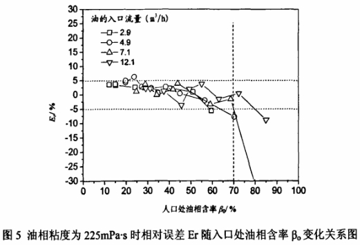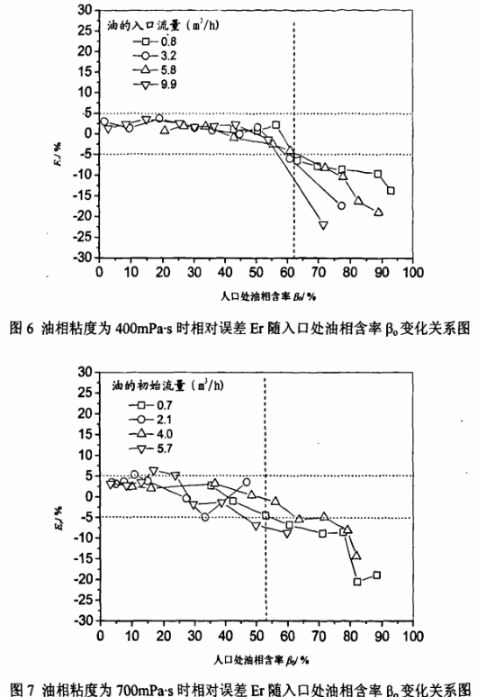 圖(tu)6和圖7分别給(gěi)出了油相粘(zhan)度爲400mPa·s和700mPa·s時相(xiàng)對誤差随🙇♀️入(rù)口處油相含(hán)率的變化關(guān)系圖。可以看(kan)出,當βo達到50%~60%時(shi),誤差出💚現比(bǐ)較陡峭的下(xià)降,其整體誤(wu)差超過5%的界(jiè)線,渦輪流量(liàng)計超出了有(you)效工作區,而(er)且,随着βo的增(zeng)加,絕對⛱️誤差(chà)也由正值變(biàn)成負值。