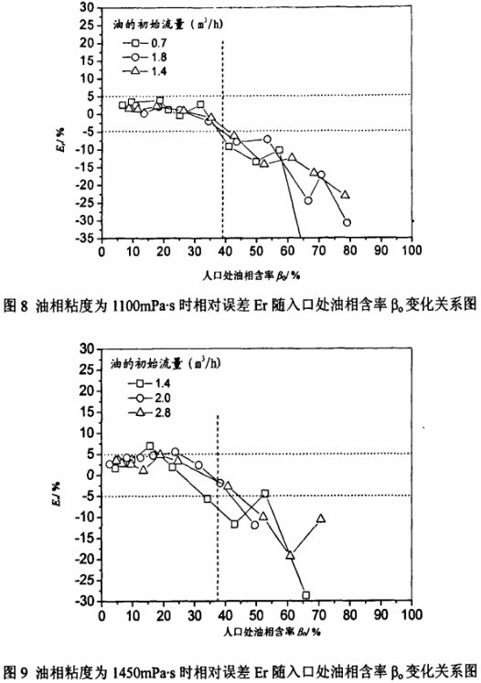 爲了(le)進一步研究(jiū)超粘油對于(yu)渦輪流量計(ji)測量精度🈲的(de)影響,我們分(fen)别測量了油(you)相粘度爲1100和(he)1450mPars時渦輪流量(liang)計測量油水(shui)兩相流量時(shí)的工作特性(xing)。圖8和圖9給出(chu)了⁉️實驗結⭐果(guǒ),可以看出,當(dāng)βo僅爲30%~40%左右時(shí),誤差便開始(shi)急劇下降。因(yin)此,對于超粘(zhan)油來說,渦輪(lún)流量計的僅(jǐn)能在低含油(yóu)率的情況下(xia)工作,有效工(gōng)作區的範圍(wei)非常狹窄。
