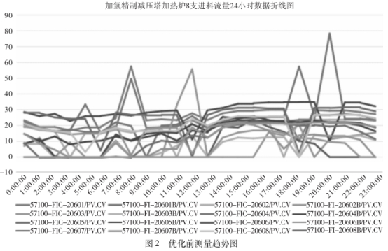 1)優化(hua)前加氫(qing)減壓塔(ta)加熱爐(lú)8路進料(liào)流量在(zài)2025年12月某(mǒu)㊙️-天24h的測(cè)量折線(xian)圖如圖(tú)2所示。