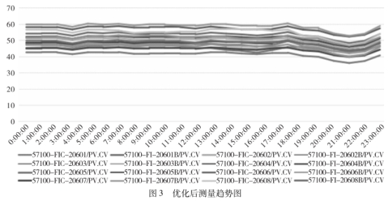2)優(yōu)化後加(jia)氫減壓(ya)塔加熱(rè)爐8路進(jìn)料流量(liàng)在2025年12月(yue)某--天24h的(de)測量折(she)線圖如(rú)圖3所示(shì)。
