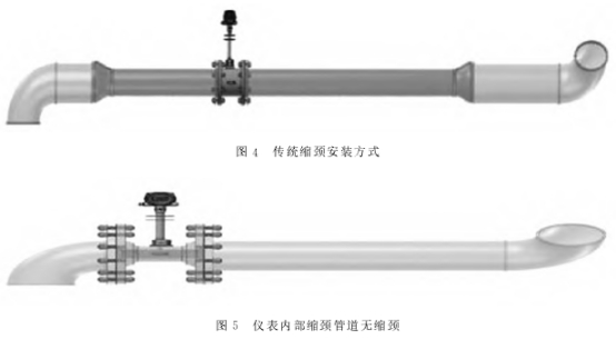 随着儀(yí)表技術(shù)的不斷(duan)發展,不(bu)同的渦(wo)街流量(liàng)計.廠家(jiā)在縮徑(jing)方🙇🏻面的(de)技術開(kai)始出現(xiàn)較大的(de)差異化(huà)。較🔞傳統(tǒng)的縮徑(jing)方🧡式(見(jian)圖4),有的(de)廠家開(kāi)發出了(le)可内縮(suo)一檔、兩(liǎng)檔的産(chan)❌品,也有(you)可以無(wu)極數限(xiàn)🔞制無限(xiàn)内縮的(de)産品,或(huo)者僅需(xū)大小頭(tou),無需變(biàn)徑直管(guǎn)段的産(chan)品(見圖(tu)5)。