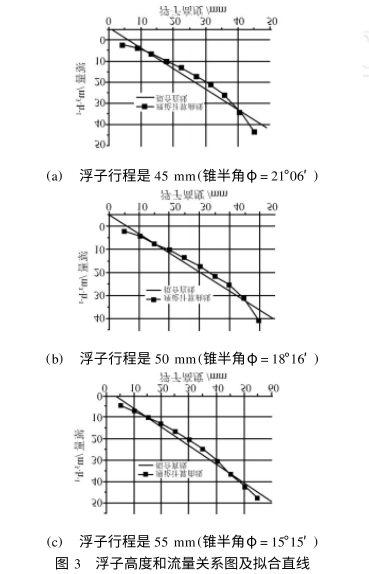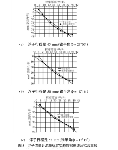 如圖3所(suǒ)示,(a)、(b),(c)分别(bié)是行程(cheng)爲45mm,50mm和55mm的(de)浮子流(liú)量計浮(fú)子高度(dù)和❄️流量(liàng)間對應(ying)關系曲(qu)線及利(li)用最小(xiǎo)二乘法(fǎ)拟合的(de)直線.從(cong)表1.表2,表(biǎo)3中第三(san)列所示(shì)的非線(xian)性誤差(chà)數據可(ke)以看出(chu),當利用(yong)公式(1)進(jin)行流量(liang)計算時(shi)在不同(tong)的流量(liàng)點處流(liú)量和浮(fú)子高度(dù)之間表(biao)現出了(le)不同的(de)非線性(xing)誤差,流(liu)量和🌐浮(fu)子高度(du)之間不(bu)是線性(xìng)對應關(guan)系.