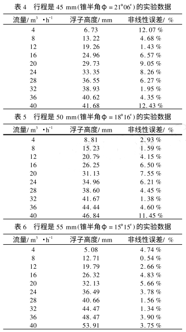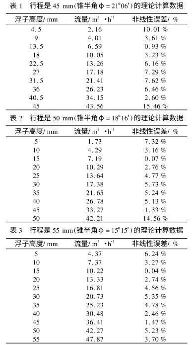 在公(gong)式(1)中,當(dāng)流量傳(chuán)感器的(de)結構以(yi)及被測(cè)流體介(jie)質确定(dìng)下來後(hou),φ、Vf、ρf、ρ、Af、D0、Dh、df以及α這(zhe)些變量(liang)都是已(yi)知量,是(shi)不變的(de).表1、表2,表(biǎo)3分别給(gei)出了利(lì)用公式(shi)(1)計算的(de)行程爲(wei)45mm,50mm和55mm的情(qíng)況下浮(fu)子🚶高度(dù)和流量(liang)之間的(de)對💃應關(guān)系,其中(zhong)💛浮子高(gāo)度是浮(fu)子在錐(zhui)管中的(de)垂直位(wei)置.數據(jù)表中的(de)第三列(liè)是利用(yong)公式(3)計(jì)算出來(lái)的相應(yīng)流量點(diǎn)的非線(xiàn)性誤差(chà).