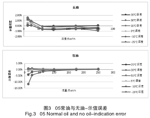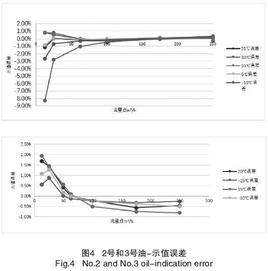 2)清洗軸承使其沒(mei)有油脂,再添加3号(hao)潤滑油,在常溫下(xia)運👅行2h,保證加油後(hòu)的軸承性能滿足(zú)要求,試驗該❓流量(liàng)計在-25℃、-10℃、+20℃、+55℃下的計量示(shì)值誤差及重複性(xing),結果如圖4。