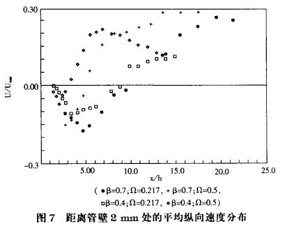 摘(zhāi)要:本文介紹(shao)旋渦流對孔(kǒng)闆流量計 性(xìng)能影響的結(jié)果。主要對β值(zhi)和旋渦強度(du)進行了分析(xi)。該項工作生(sheng)要基于流動(dong)圖形測試法(fa)、IDA激光多普勒(lè)測速和管壁(bi)壓力測量法(fǎ),借助一個流(liu)體動力學裝(zhuāng)置完成的。另(ling)外,還對管内(nei)流動與△p差壓(ya)測量之間的(de)關系進行了(le)FENXI 。 概述 該工作(zuo)的主要目的(de),一方面是更(gèng)好地了解孔(kong)闆兩側的穩(wěn)定流和不穩(wen)定流現象,另(lìng)一方面是确(que)定上遊流動(dòng)幹擾對内部(bu)流動特性和(he)對流量測量(liàng)的實際影響(xiang)。爲了達到上(shàng)述目的,采用(yòng)了多種試驗(yàn)和數值計算(suan)方法。 在試驗(yàn)中,采用了流(liú)動圖像法,激(ji)光多普勒測(cè)速儀(L.D.V)測量二(èr)維速度和管(guan)壁差壓測量(liang)法。 試驗時,選(xuan)取了2個β值(0.4和(hé)0.7)。雷諾數(Uv·D/v)在104~2×105之(zhi)間。 二、試驗設(she)備 1.試驗裝置(zhì) 圖1爲試驗裝(zhuāng)置,主要由水(shui)平試驗管路(lu)及一台離心(xīn)泵組成。該離(lí)心泵通常在(zai)過壓狀态下(xia)運行。試驗時(shí),由離心泵将(jiang)水箱A(容積爲(wei)1m³)中的水抽出(chū),其最大排量(liàng)爲140m³/h,輸出相對(duì)壓力爲20m水柱(zhù)。由泵輸送的(de)水,一部分通(tōng)過主試驗管(guǎn)路的試驗段(duan),另-部分經旁(páng)通管路返回(huí)到原來的水(shui)箱中。主試驗(yan)管路是一段(duan)口徑爲125mm的直(zhí)管段,一台标(biao)準電磁流量(liàng)計安裝在該(gai)直管段上,其(qí)準确度爲1%。該(gai)直管段的末(mo)端與密閉水(shuǐ)箱B相連,這樣(yàng)可以消除由(yóu)離心泵引起(qi)的任何脈動(dong)流影響。在水(shuǐ)箱B的出口裝(zhuang)有口徑爲100mm的(de)直管段,其中(zhong)測試段就安(an)裝在此直菅(jian)段上。試驗中(zhong),水返回到水(shuǐ)箱A或者被排(pai)出。另外,試驗(yàn)時還可向水(shui)中注人染料(liào)。利用2個并聯(lián)安裝在試驗(yàn)段下遊的控(kòng)制閥來調節(jiē)通過試驗段(duan)的水流量。爲(wèi)了避免試驗(yàn)過程中水介(jie)質的溫度上(shang)升,設置了一(yi)台循環水式(shì)換熱器。在環(huán)路中冷卻水(shui)的流量采用(yòng)伺服控制,其(qí)溫度偏差在(zai)±0.5C範圍内。試驗(yan)段上遊口徑(jìng)100mm直管段的長(zhang)度爲4m,在其人(ren)口安裝了一(yi)台管束式整(zhěng)流器。試驗段(duàn)由孔闆兩側(ce)分開,分爲上(shàng)遊和下遊試(shi)驗段。試驗管(guǎn)段采用有機(ji)玻璃透明管(guan)段,以便觀測(cè)流型和激光(guang)多普勒測速(sù)。由于在空氣(qi)和有機玻璃(li)管段之間存(cun)在讀數偏差(cha),爲了避免有(you)機玻璃管段(duàn)産生的折射(she),而将有機玻(bo)璃管段的外(wài)壁做成平面(mian)。爲了更好地(dì)觀察孔闆兩(liǎng)邊的流動狀(zhuang)态,孔闆兩側(ce)的法蘭是經(jing)過特殊的,盡(jìn)量保證爲0.15D。孔(kǒng)闆上、下遊的(de)直管段長度(dù)爲0.5m。這樣就可(ke)完成孔闆兩(liang)側回流區的(de)試驗:甚至β值(zhi)爲0.4也可以。 2.旋(xuan)渦流發生器(qì) 旋渦流是由(you)一種切向流(liu)發生器産生(sheng)的,如圖2所示(shì)。部分流體從(cong)其人口沿着(zhe)與軸線成切(qie)線方向進人(rén),從而産生旋(xuán)轉流。旋渦強(qiáng)度的确定借(jiè)助于軸向流(liu)量Q軸向和總(zǒng)流量Q總流量(liang)之間的關系(xi)來定。即用無(wu)量綱旋流系(xì)數Q表達,其變(biàn)化範圍爲0(無(wú)旋流)至1(最大(da)旋流),數字表(biǎo)達式爲: 據有(yǒu)關文獻介紹(shào),旋渦強度也(ye)可用旋渦數(shù)量s來表示,即(jí)通過平均軸(zhóu)向分布U(r)和平(píng)均切向分布(bù)W(r)計算出來,表(biao)達式爲: 該旋(xuan)流系數n可以(yǐ)通過試驗與(yu)經典的旋流(liú)數S用線性關(guan)系聯系起來(lai)。 三、試驗結果(guǒ) 在試驗過程(cheng)中,β值爲0.7和0.4,雷(lei)諾數爲100000。 1.流動(dòng)狀态觀測 在(zài)與管道同直(zhi)徑的孔闆的(de)邊緣處設置(zhi)2個毛細管,并(bing)且與管道的(de)軸線對稱。試(shi)驗時,向兩根(gēn)毛細管中注(zhù)人示蹤劑(氣(qì)體或液體),觀(guan)測孔闆下遊(yóu)的流動狀态(tài)。爲了清晰地(dì)觀察流動狀(zhuang)态,在透明管(guan)段上遊放置(zhì)一照明設備(bei),其光束可以(yǐ)與軸線平行(háng)或垂直。 觀察(cha)結果表明,旋(xuán)渦流使得射(shè)流擴大而回(huí)流區減小。而(er)且,當旋流系(xì)數n較大和β值(zhí)較小時,孔闆(pǎn)下遊處有明(ming)顯的射流沖(chòng)擊,使得作用(yong)在管壁上的(de)壓力産生很(hěn)大的波動。. 2.速(su)度測量 試驗(yan)中,使用了一(yi)台二維激光(guāng)多普勒測速(sù)儀。在旋流強(qiáng)度Ω爲0.2和0.5時,進(jìn)行了測試。 3.上(shàng)遊流動狀态(tai) 圖3示出了在(zai)孔闆上遊1D處(chu)測得的平均(jun)軸向速度U和(he)切向速度W的(de)分布情況。 從(cong)中可以看出(chū),随着旋渦強(qiang)度的增加,軸(zhou)向速度U分布(bù)趨于變平。 從(cong)切向速度分(fen)布圖中可以(yǐ)看出,旋轉以(yi)管道軸線 爲(wèi)中心并分爲(wei)兩個區域。在(zai)管道的中心(xin)(0≤r/D<0.25)爲“強旋渦型(xíng)”區,在該區内(nèi)切向速度W與(yu) 半徑r成正比(bǐ)。接近于管壁(bi)時,出現了一(yi)個由于摩擦(ca) 使得旋轉速(sù)度降低的區(qu)域。 利用上述(shù)的速度分布(bu)圖,可以計算(suan)出旋渦數s和(hé)旋渦角θs。因此(cǐ),當Ω=0.2時,S=0.1、θs=9