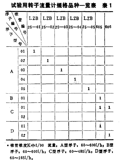 試驗(yàn)用轉子流量計(jì)的規格品種見(jian)表1。