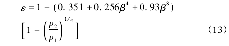 式中:ε爲可(kě)膨脹性系數(shù);β爲節流孔直(zhi)徑與測量管(guǎn)直徑的比值(zhí);p,爲㊙️節流孔上(shàng)遊壓力,Pa;p2爲節(jiē)流孔下遊壓(yā)力,Pa;K爲流體等(děng)☂️熵指數。