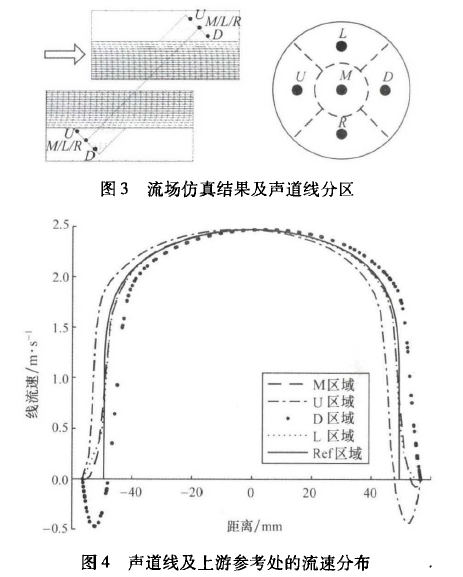 式中,L爲聲道長(zhang)度。将△t代人到式(5)中(zhōng),可以解得聲道方(fang)向的平均流速V'm。聲(sheng)場仿真計算中,△t=1.986x10-7s,L=113.0mm,求(qiú)得V'm=I.928m/s。