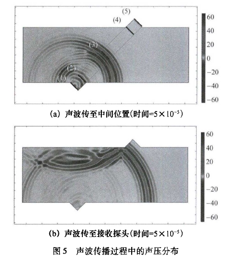 圖7爲(wei)超聲傳播過程中(zhong)不同位置聲壓振(zhèn)幅的分布情況,其(qí)中位置1~位置5已在(zai)圖5(a)中标注,統計的(de)是聲波經過該位(wei)置的聲壓變化的(de)振幅。在探頭A處的(de)壁面反射造成了(le)發射聲壓分布的(de)畸變,在傳輸過程(cheng)中逐漸減少了它(tā)的影響,所以探頭(tou)B所接收的聲壓主(zhu)要受到B處壁面反(fan)射的影響,在探頭(tóu)B附近低壓中心📐從(cong)上遊逐漸向下遊(yóu)移動。