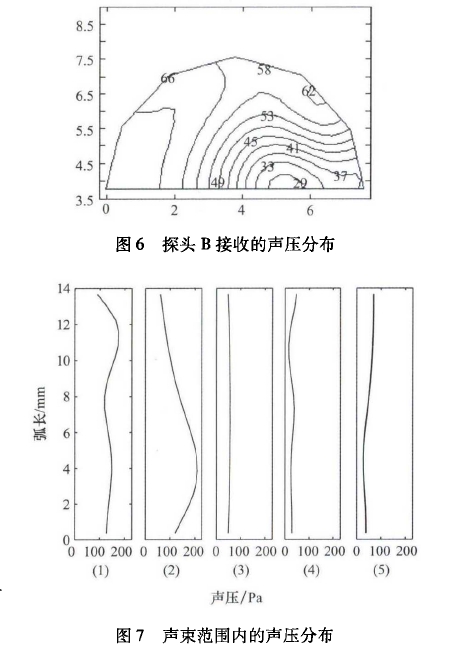 圖5展(zhan)示了探頭A發射超(chāo)聲波時,超聲波的(de)傳播過程。在探頭(tou)A、探頭✏️B的壁面處,超(chao)聲波發生了反射(shè),反射信号和原信(xin)号相互疊加,造成(cheng)了接收面聲壓的(de)不對稱,進而影響(xiang)傳播時間的測量(liang)。探頭B接‼️收聲壓的(de)分布情況如圖6所(suǒ)示,聲壓在接收面(miàn)上非均勻分布,在(zai)㊙️接收面上分布-一(yī)個低壓區,低壓區(qu)中心位于中心偏(piān)下遊的位✊置。