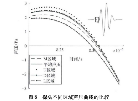 由于旋(xuán)渦和璧面反射的(de)影響,靠近探頭邊(bian)緣區域的✔️聲壓曲(qǔ)線存在一定畸變(biàn)。探頭B不同區域接(jiē)收的聲壓與平均(jun1)聲👄壓的關系如圖(tu)8所示。其中實線代(dài)表平均聲📞壓,虛線(xian)代表M區域處的聲(sheng)壓變化。聲波傳播(bō)過程中,受到不同(tóng)聲波傳播路徑和(he)壁面反射的影響(xiǎng),接收面不同位置(zhi),接收聲壓幅值與(yu)過零點有明顯的(de)區别。M區☀️域處聲壓(ya)曲線幅📧值略高于(yú)平均聲壓曲線、過(guo)零點與平均聲壓(ya)曲線接近;U區域和(he)D區域處聲壓曲線(xian)過零點與平均曲(qǔ)線有較大差異。