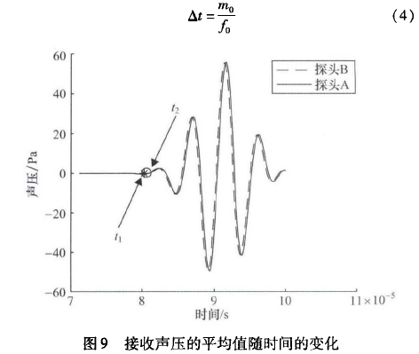 由(you)于探頭不同區域(yù)聲壓變化曲線的(de)差異,采用平均聲(sheng)壓曲線來計算時(shí)間差,平均聲壓的(de)計算結果接近聲(sheng)壓👄中心,而且有更(gèng)好的穩定性。探頭(tou)A、探頭B接收到的平(píng)均聲壓變化曲線(xian)如圖9所示✌️,探頭A由(you)于流體的減速作(zuo)用收到波形略晚(wǎn)📐,兩個波形✌️的相似(sì)度較高。利用互相(xiàng)關函數計🆚算時差(cha):