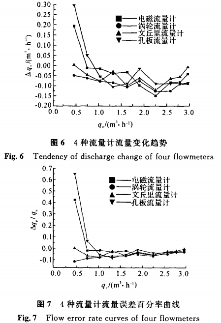 分析圖(tú)6和圖7,當流量(liàng)0.451m3/h時,管中水速(sù)爲0.255m/s,雷諾數Re=6336,處(chù)于紊流狀态(tài)。對于電磁流(liú)量計,測量精(jing)度主要受傳(chuán)感器性能的(de)影響,流速較(jiao)低時積聚在(zài)電極上的電(dian)荷較少,受縱(zòng)向速度影響(xiang)明顯,因此出(chu)現較大的偏(piān)差;在流量逐(zhu)漸增加的過(guò)程中,縱向速(su)度的影響逐(zhú)漸減小,誤差(cha)減小,精度、可(ke)靠性增加,說(shuō)明電磁流量(liang)計在小流量(liang)時精度較低(di)。對于渦輪流(liú)量計,流量與(yu)渦輪轉速成(chéng)比例,與儀表(biao)常數有關,小(xiao)流量時出現(xian)偏差,測量值(zhi)偏小,這是因(yīn)爲此時葉輪(lun)的機械摩擦(ca)阻力及磁阻(zu)尼力矩相對(dui)旋轉力矩較(jiào)大,因此所測(ce)的流量值偏(piān)小;随着流量(liàng)的增加,旋轉(zhuan)力矩增大,誤(wu)差逐漸減小(xiao),精度、可靠性(xìng)增加。.對于文(wen)丘裏流量計(jì),屬于平緩節(jie)流,所測過程(cheng)中受旋渦影(yǐng)響較小,且沒(méi)有旋轉部件(jiàn),精度取決于(yu)試驗标定,因(yin)此精度、可靠(kào)性較高,說明(míng)文丘裏流量(liàng)計适應性較(jiào)廣。對于孔闆(pǎn)流量計,小流(liú)量時所測數(shu)據偏大,這是(shi)因爲此時壓(yā)差△p較小,易受(shòu)流體擾動的(de)影響,孔闆前(qián)後區域存在(zài)旋渦,因而測(cè)量偏差較大(dà);随着流量的(de)增加,旋渦的(de)影響減小,精(jīng)度、可靠性增(zeng)加,說明孔闆(pan)流量計不适(shi)于測量較小(xiao)流量。流量從(cong)0.745m3/h增加1.899m3/h的過程(chéng)中,電磁流量(liàng)計的精度要(yào)略高于渦輪(lún)、文丘裏和孔(kong)闆流量計,精(jīng)度都能達到(dao)1級。流量從1.899m3/h增(zeng)加2.963m3/h的過程中(zhōng),各流量計精(jing)度都較高,表(biǎo)現在圖7中的(de)曲線趨于一(yi)點。