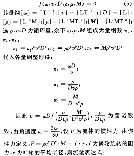 當渦(wo)輪結構一定(dìng)時,渦輪流量(liang)計流速v與葉(yè)輪的轉速相(xiàng)關,故影響因(yin)素有:葉輪的(de)旋轉角速度(du)w、流體密度ρ、動(dong)力黏度系數(shù)μ、管徑D、葉輪轉(zhuǎn)動的阻力矩(jǔ)M(包括摩擦阻(zu)力矩和磁阻(zu)尼力矩等).據(ju)π定理:
