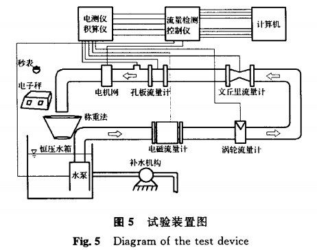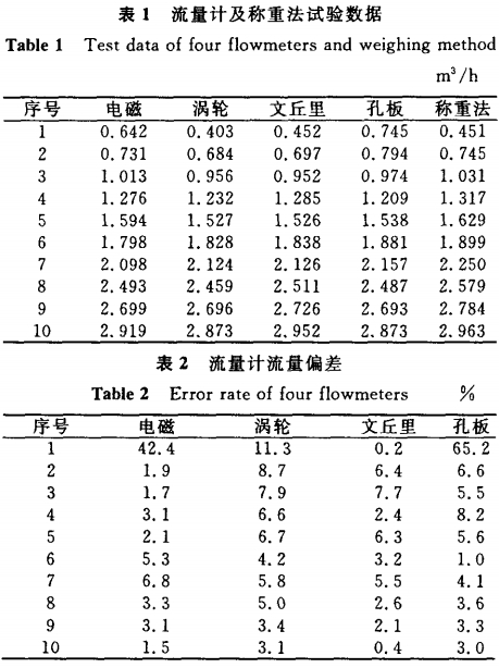 采用(yong)标準孔闆角(jiǎo)接取壓,β=0.450;文丘(qiu)裏流量計采(cǎi)用圓錐形文(wén)丘裏管,β=0.628;電磁(ci)流量計傳感(gan)器型号LDG-25S,精度(du)1級;渦輪流.量(liàng)計傳感器型(xíng)号LWGY-25A,精度0.5級。輔(fu)助補水機構(gòu)的作用是當(dāng)用稱重法測(cè)量時,對水箱(xiang)進行補水以(yi)保持水箱水(shui)位不變,形成(cheng)管道内恒速(su)定常運動。系(xi)統管徑φ25mm,流量(liang)範圍0~3m3/h。各流量(liàng)計數據由計(jì)算機瞬時采(cai)集。稱重法由(yóu)秒表記錄時(shí)間,電子秤測(cè)試重量,采用(yòng)同一流量測(ce)3次,取平均值(zhí)爲測定流量(liàng)。同一流量4個(gè)流量計和稱(cheng)重法同時測(cè)量,測定流量(liang)值各不相同(tóng),以稱重法爲(wèi)真值基準,通(tong)過分析對比(bi),揭示各自的(de)性能特點。