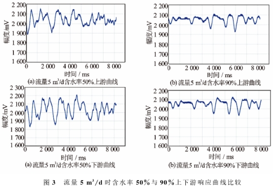 如(ru)圖3所示,選取流(liu)量爲5m3/d、含水率分(fèn)别爲50%與90%的上下(xià)遊曲線進行分(fèn)🐆析。從圖3中可以(yi)看出,不同含水(shui)率下,測得的上(shang)下遊曲💯線中,對(dui)應響應波形的(de)時間差是相等(deng)的。但是低含👄水(shui)率下,響應頻✂️率(lǜ)比較高,高含水(shuǐ)率下,響應頻率(lü)比較低,這就說(shuō)明,這種傳感器(qi)獲取的流量信(xin)息隻💜與時間有(you)關🧡,而與含水率(lü)的多少無關🏒。