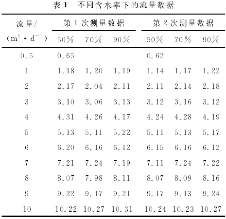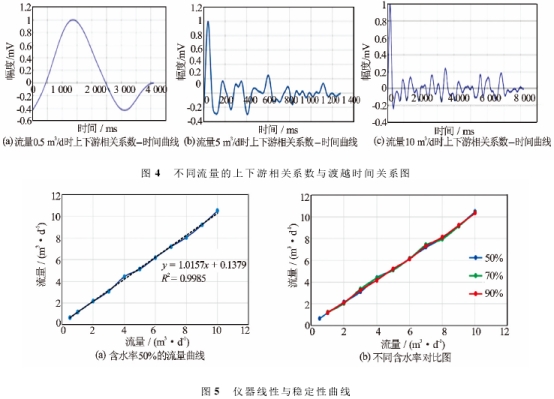 根據渡越時間(jiān)與流量關系,将(jiang)測得渡越時間(jiān)換.算爲流量數(shù)據,得到表1。從表(biao)1中可以看出,各(ge)個含水率下的(de)測量數據與标(biao)準數據之間的(de)差别不大,含水(shui)率的影響可以(yi)📧忽略不計,第1次(cì)測量數據和第(di)2次測✊量數據之(zhī)間吻合比較好(hao)。對表1中的數據(ju)進行分析,得到(dào)圖5。圖5(a)對含水率(lü)50%的各個流量數(shu)據進行了拟合(hé),得到了拟合曲(qǔ)🐉線和方程,在0.5~10m3/d的(de)線性度良好,能(néng)達到0.99,圖5(b)對不同(tong)含水率🔅下的各(gè)個流量點🈲進行(hang)重疊,可以💛看⭕出(chū)在不同含水率(lü)下,各個流量點(dian)的🏃🏻測量數據與(yu)✌️複測數據🔱吻合(he),具有很㊙️好的重(zhòng)複性和穩定性(xing)。