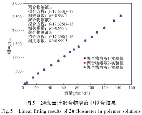 圖5爲2#電(diàn)磁流量計在(zài)0~200m³/d流量範圍,濃(nong)度分别爲1000、1500、2000mg/L聚(ju)合物溶液中(zhōng)的測量數據(ju)及線性拟合(hé)結果,将2#電磁(cí)流量計在3種(zhǒng)聚合物溶液(yè)中得到的儀(yí)器常數(線性(xing)拟合曲線的(de)斜率)分别記(ji)爲K,=17.633、K8=17.625、K9=17.608。