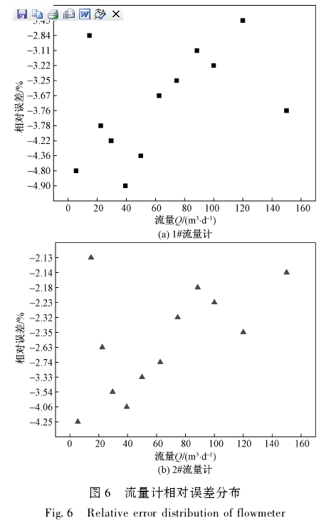 圖6分别爲對(dui)1#電磁流量計(ji)和2#電磁流量(liàng)計利用在清(qing)水中層流流(liú)态的測量數(shù)據獲得的标(biāo)定方程計算(suan)濃度爲1500mg/L聚合(hé)物溶液流量(liàng)的相對誤差(chà)分布圖,1#電磁(cí)流量計和2#電(dian)磁流量計最(zuì)大相對誤差(chà)的絕對值分(fèn)别爲4.90%和4.25%,符合(he)流量測量誤(wù)差要求,證實(shí)本文提出的(de)電磁流量計(jì)新方法有效(xiào)、可行。最後,對(duì)2支電磁流量(liàng)計,通過開展(zhan)分層注聚合(hé)物井的現場(chang)測調試驗,對(duì)所提出的分(fen)層注聚合物(wu)井的電磁流(liú)量計新方法(fa)進行驗證,以(yǐ)評價現場實(shí)際應用效果(guǒ)。表2所示爲對(dui)2支電磁流量(liang)計完成的現(xiàn)場試驗情況(kuang)統計表,總共(gòng)完成分層注(zhu)聚合物井現(xiàn)場試驗176口,全(quan)井注人流量(liàng)小于50m³/d的分層(ceng)注聚合物井(jing)共45口,其中測(cè)量誤差小于(yu)5%的井占比95.6%;全(quan)井注人流量(liàng)在50~100m³/d的分層注(zhu)聚合物井共(gòng)試驗73口其中(zhōng)測量誤差小(xiǎo)于5%的井占比(bi)95.9%;全井注人流(liu)量在100~200m³/d的分層(ceng)注聚合物井(jing)共試驗58口,其(qi)中測量誤差(cha)小于5%的井占(zhàn)比96.6%;現場試驗(yàn)證明所提出(chu)的分層注聚(jù)合物井的電(diàn)磁流量計方(fāng)法應用效果(guǒ)良好。