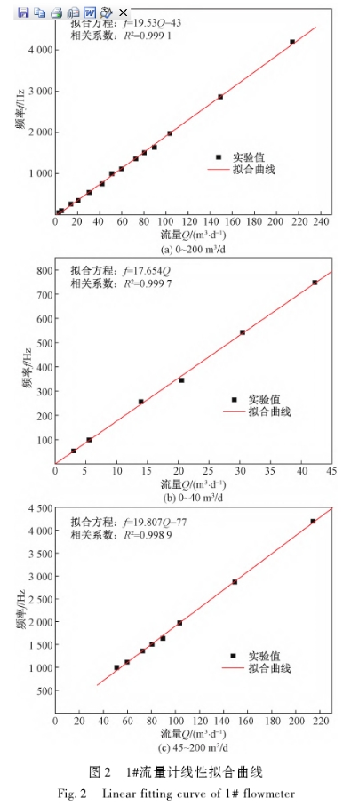 圖2所示爲(wei)1#電磁流量計(jì)在不同流量(liang)範圍自來水(shui)中的測量數(shu)據及線性拟(ni)合曲線,将流(liu)量爲0~200m³/d、0~40m³/d、45~200m³/d時的儀(yí)器常數(線性(xing)拟合曲線的(de)斜率)分别記(ji)爲K1.3=19.53、K1.1=17.654、K1.2=19.807。分别對K1.3、K1.1、K1.2進(jìn)行對比計算(suan),得