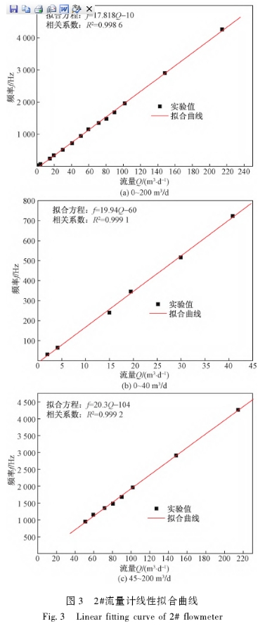 圖3所示爲(wei)2#電磁流量計(ji)在不同流量(liang)0~200m³/d範圍自來水(shui)中的測量數(shu)據及線性拟(nǐ)合曲線,将流(liu)量0~200m³/d、0~40m³/d、45~200m³/d時儀器常(chang)數(線性拟合(he)曲線的斜率(lǜ))分别記爲K2.3:=19.94K2.1=17.818、K2.2=20.3。分(fèn)别對K2.3、K,2.1、K2.2進行對(dui)比計算,得