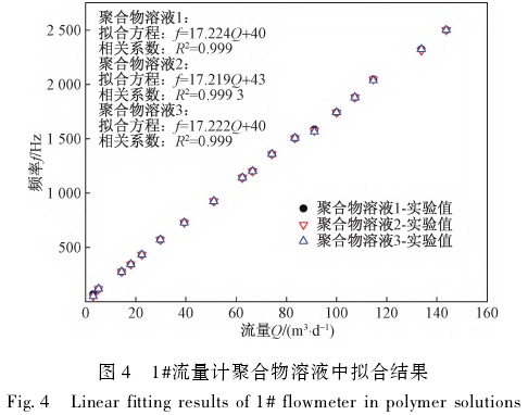 圖4爲1#電磁流(liú)量計在0~200m³/d流量(liàng)範圍,濃度分(fèn)别爲1000、1500、2000mg/L聚合物(wu)溶.液中的測(cè)量數據及線(xian)性拟合結果(guo),将1#電磁流量(liang)計在3種聚合(he)物溶液中得(de)到的儀器常(cháng)數(線性拟合(hé)曲線的斜率(lǜ))分别記爲K4=17.224、K5=17.219、K6=17.222。