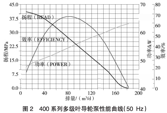 潛油電泵機(ji)組都遵循GB/T16750--2015《潛油(yóu)電泵機組》,出庫(ku)的時候都會進(jin)行🌈泵性能測試(shi),繪制泵性能曲(qu)線,也就是泵揚(yang)程、排量、泵效、軸(zhóu)功率曲線”。要求(qiú)至少采集13個點(diǎn),即在不同排量(liàng)下的壓力、泵效(xiao)、功率數據✊,來給(gěi)定泵的有效高(gāo)效區間,用以指(zhǐ)導.用戶生産。圖(tu)2爲50Hz工頻運行🐇的(de)數據曲線,給定(dìng)的高效區爲40~150m3/d。